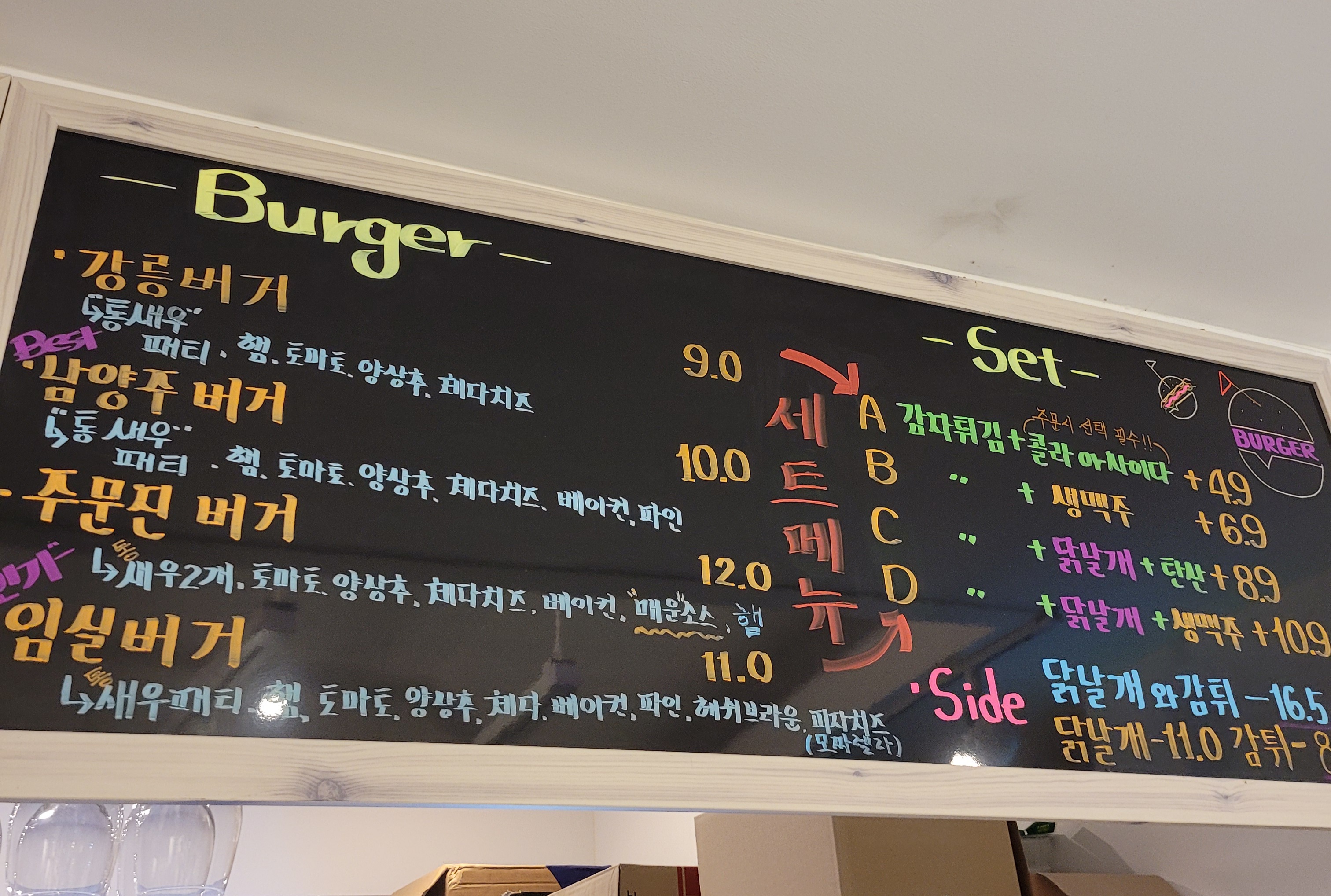 강릉버거 남양주버거 주문진버거 임실버거가 있고 세트는 기본 4900원부터 추가하면 감자튀김 콜라 사이다구요